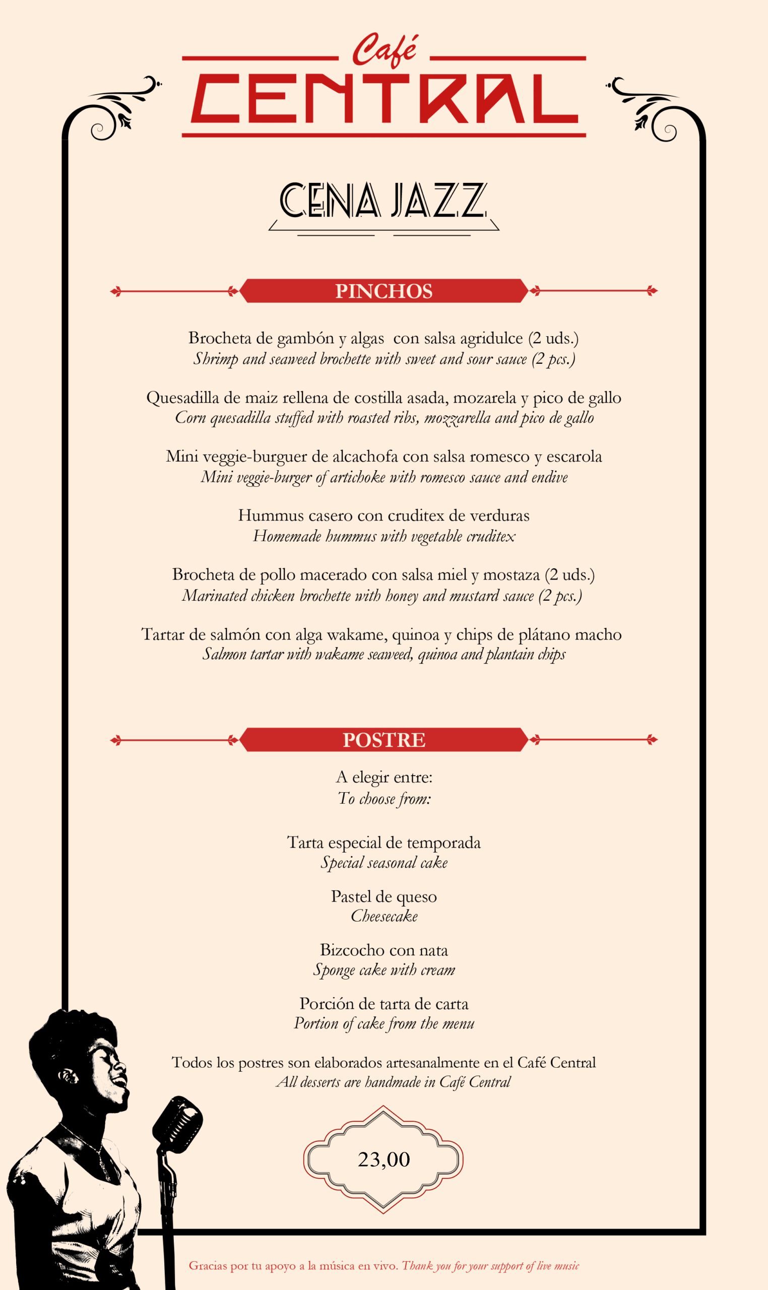 Pases a las 20h y a las 22h ¡Conciertos de resistencia! CONCIERTOS DE RESISTENCIA Con las entradas puedes elegir alguno de nuestros menús Con las entradas puedes elegir alguno de nuestros menús Ten en cuenta seleccionar el día exacto del concierto. Al realizar la reserva recibirás un correo de confirmación, si no es así, escríbenos. Sólo vendemos entradas en nuestra web y en la puerta del Central el día del concierto – En ninguna otra página ni aplicación. Los sitios se distribuyen por orden de reserva. Debido a la arquitectura del lugar, no todos los sitios ofrecen una visibilidad óptima. Es habitual tener que compartir mesa. Gracias por tu apoyo a la música en vivo